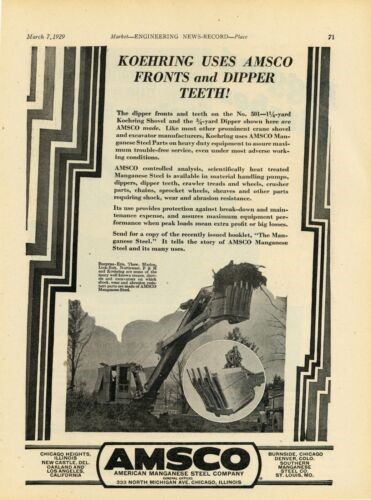 The Chicago Heights facility patented and produced the first all-manganese steel power shovel dipper. It was called the “Missabe Dipper.” They also developed the Vanderhoef dipper tooth.